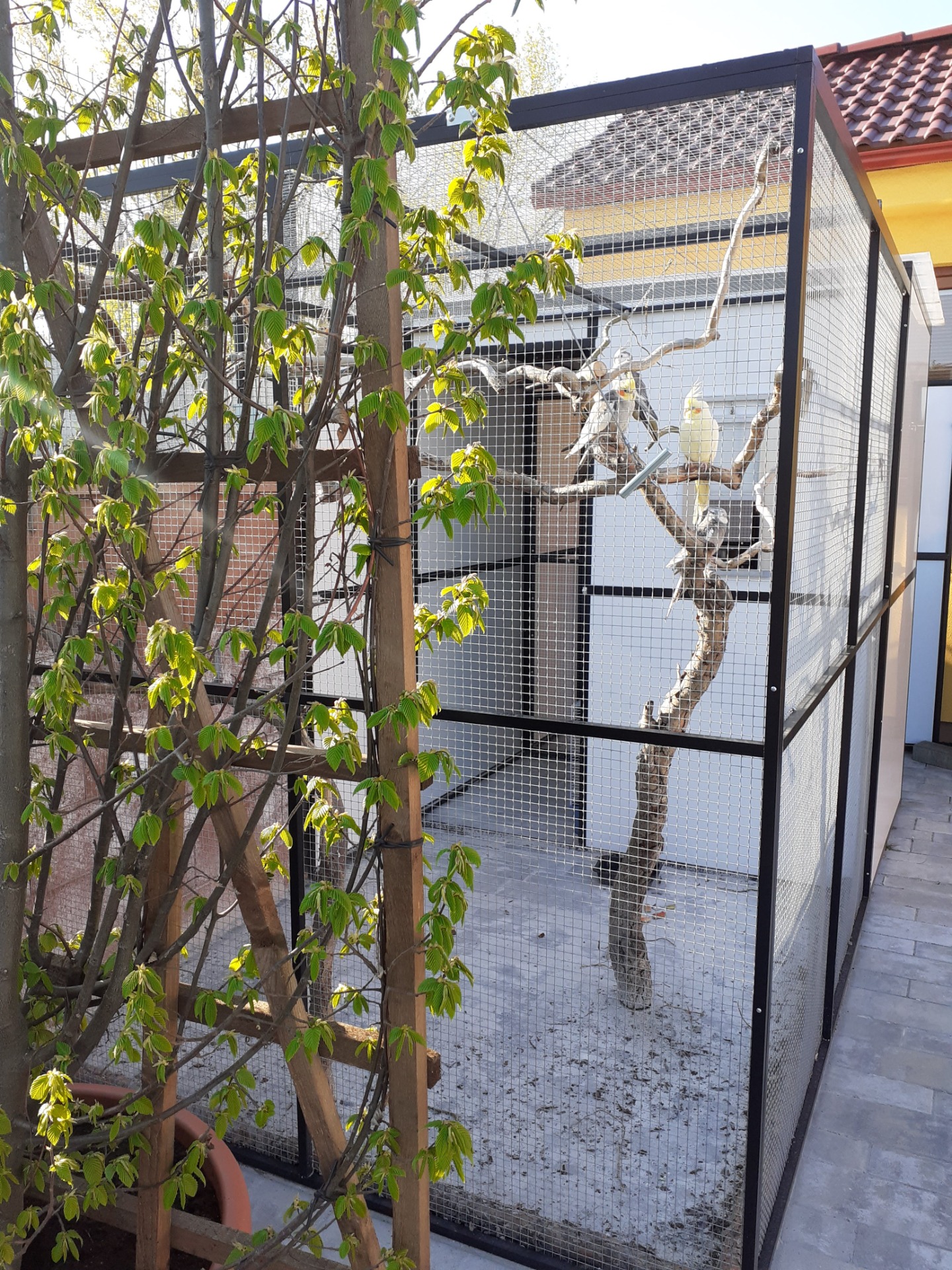 Pro rozšíření skupiny jsme pořídili venkovní voliéru se záletem. Původní myšlenka byla ponechat celoročně korely venku, ale nějak to srdce nedovolilo a na zimní období zůstávají nakonec s námi doma. Venku mají prostornou voliéru, uvnitř mají menší voliéru s možností přepažení pro případ nějakých neshod.
