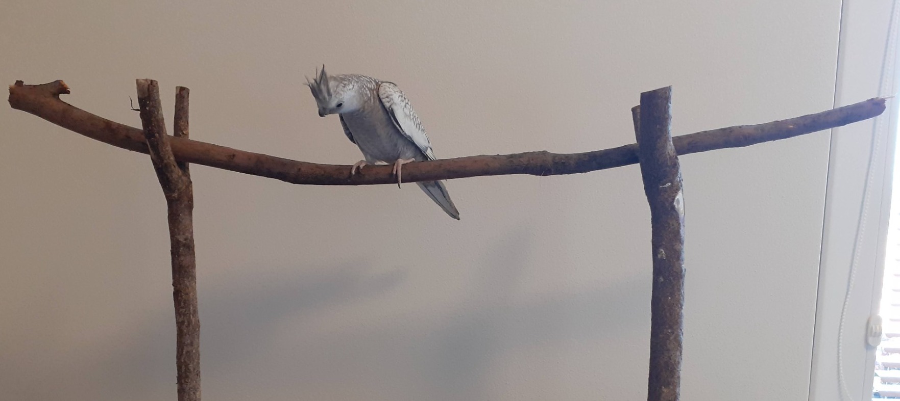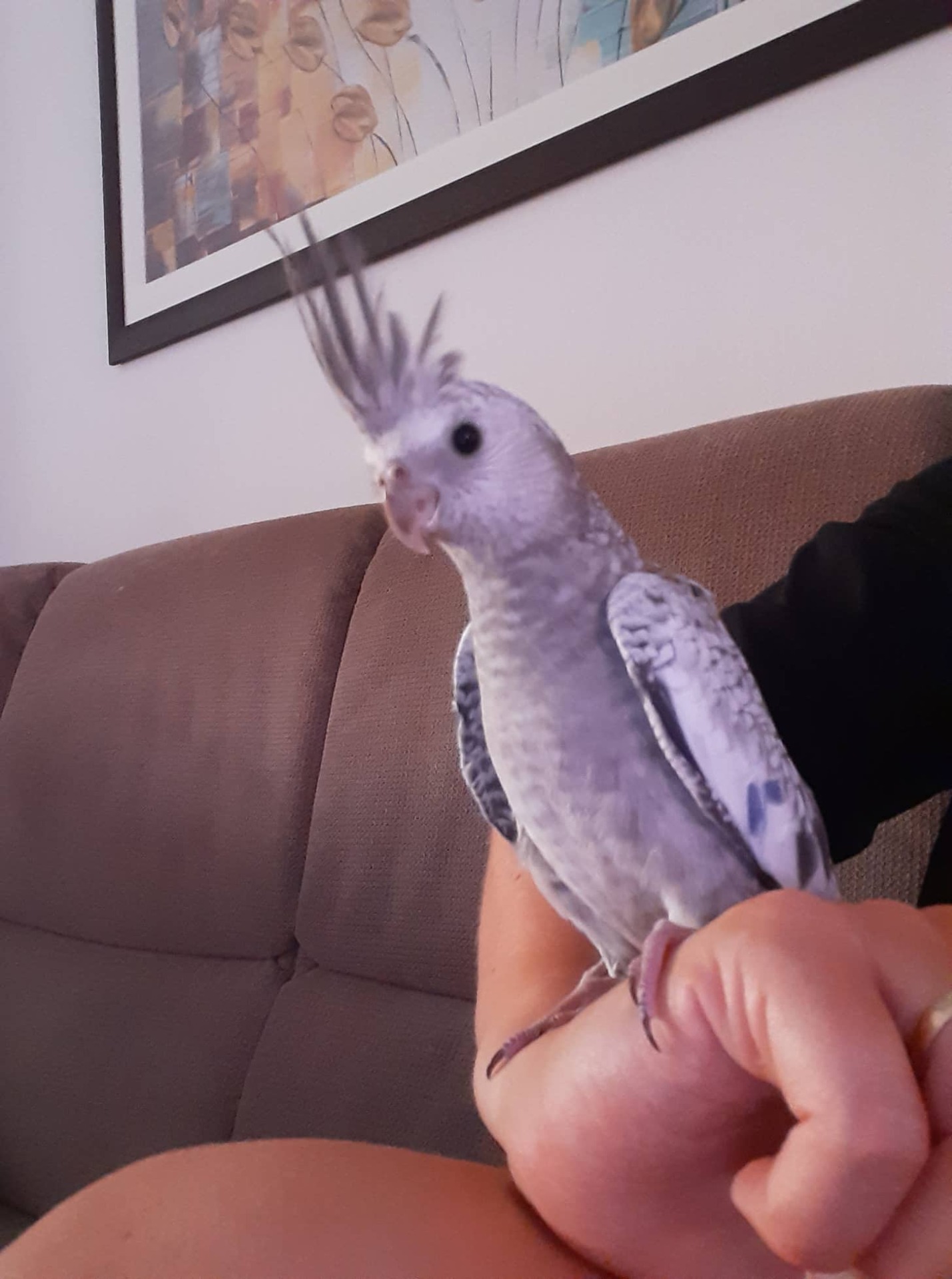 Na Charliem je vidět, že přišel do kontaktu s člověkem už od mala, nebo má dobrý genetický základ, nebojí se. I když je z venkovní voliéry ochočování, tedy stoupnutí na prst, trvalo jen pár dní, možná hodin. Na fotce je vidět označení fixem, díky kterému ho chovatelé rozpoznávali.